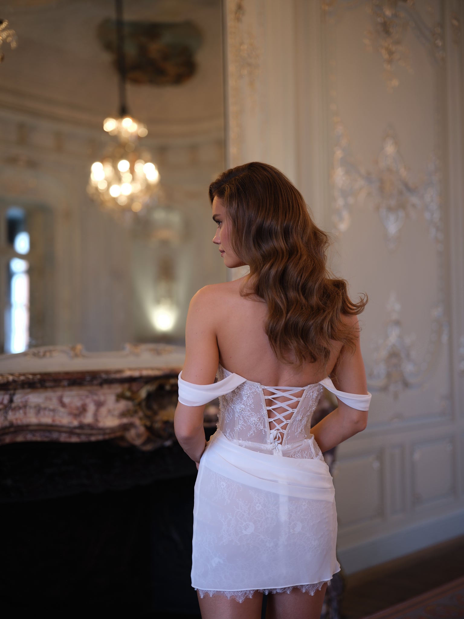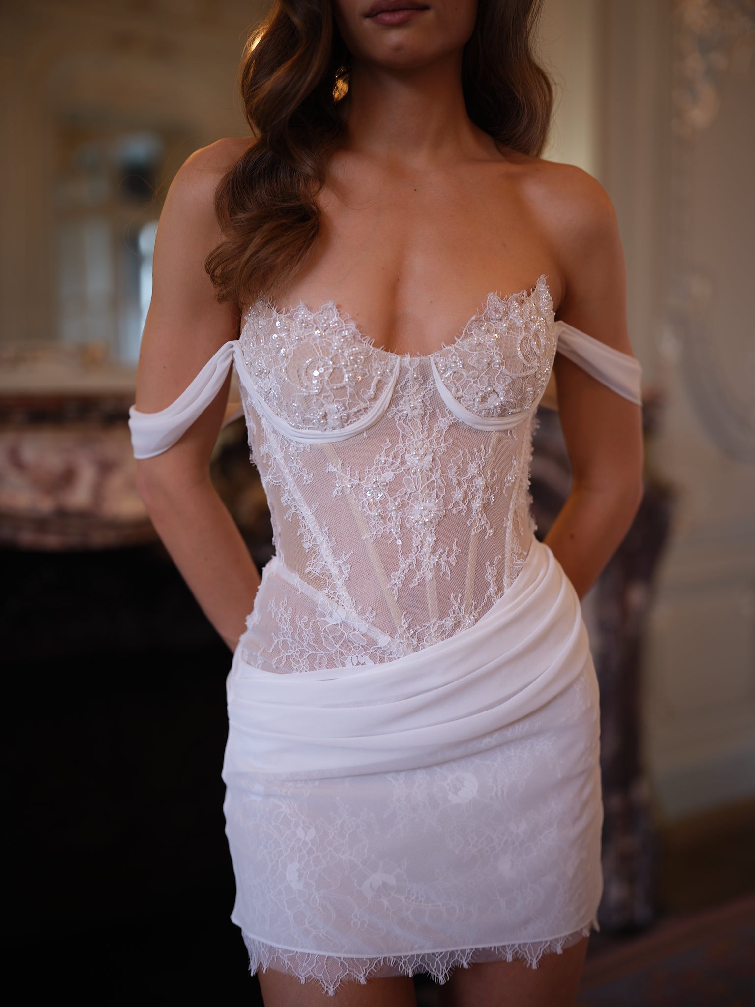 Off-shoulder chiffon arm drapes frame the neckline with effortless grace, balancing the structured bodice with fluid softness. The mini skirt is finished with a delicate lace hem and a gently draped chiffon overlay at the waist, adding texture and movement while flattering the hips.