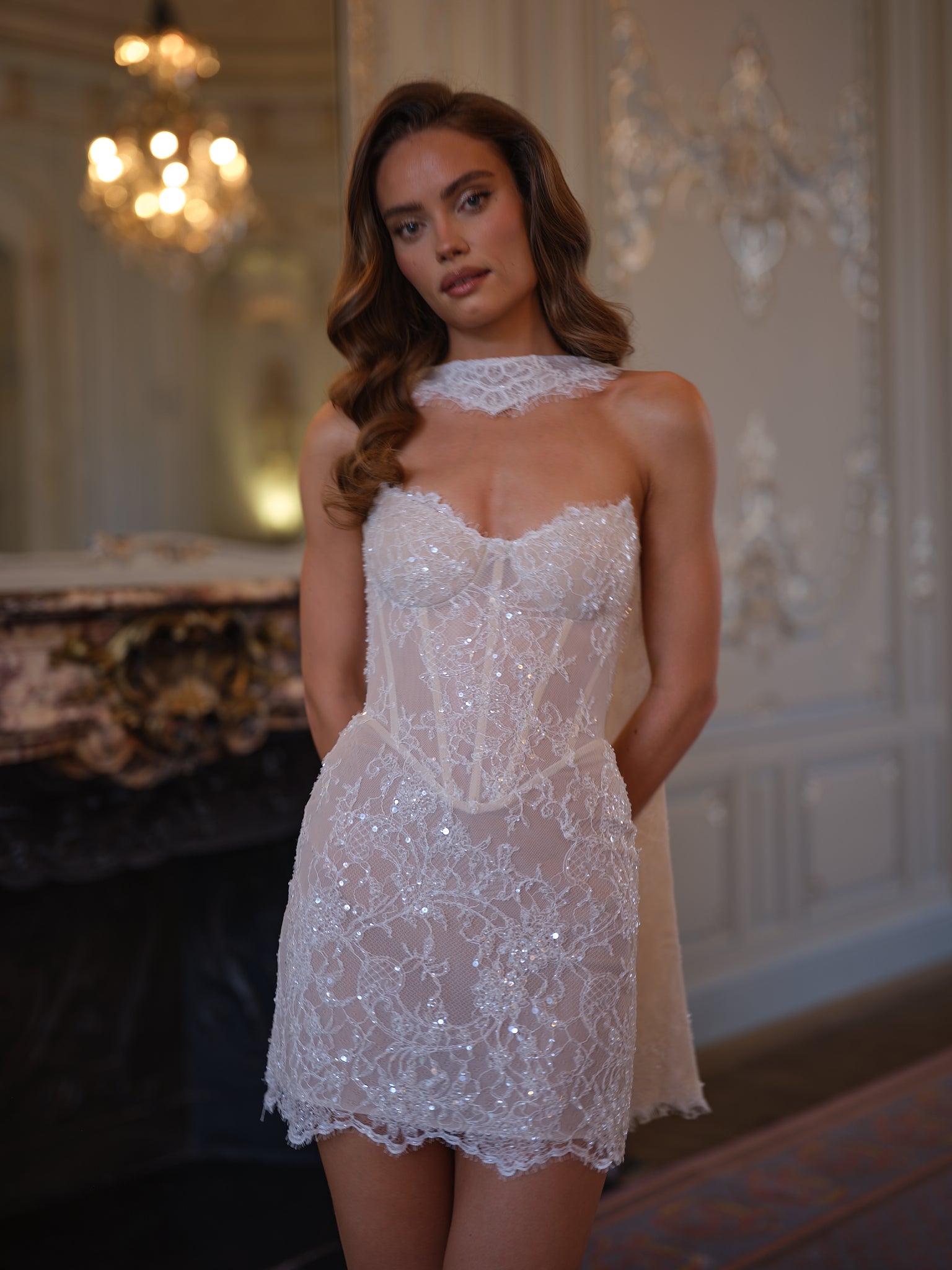 This strapless silhouette highlights a sculpted corset bodice with sheer paneling and precise boning for a flawlessly contoured fit. Intricately embroidered lace overlays shimmer with sequin embellishment, scattering light across every movement. The scalloped mini hem softens the bold structure, while the matching lace neck scarf adds a touch of Parisian-inspired elegance—polished yet playfully unexpected.