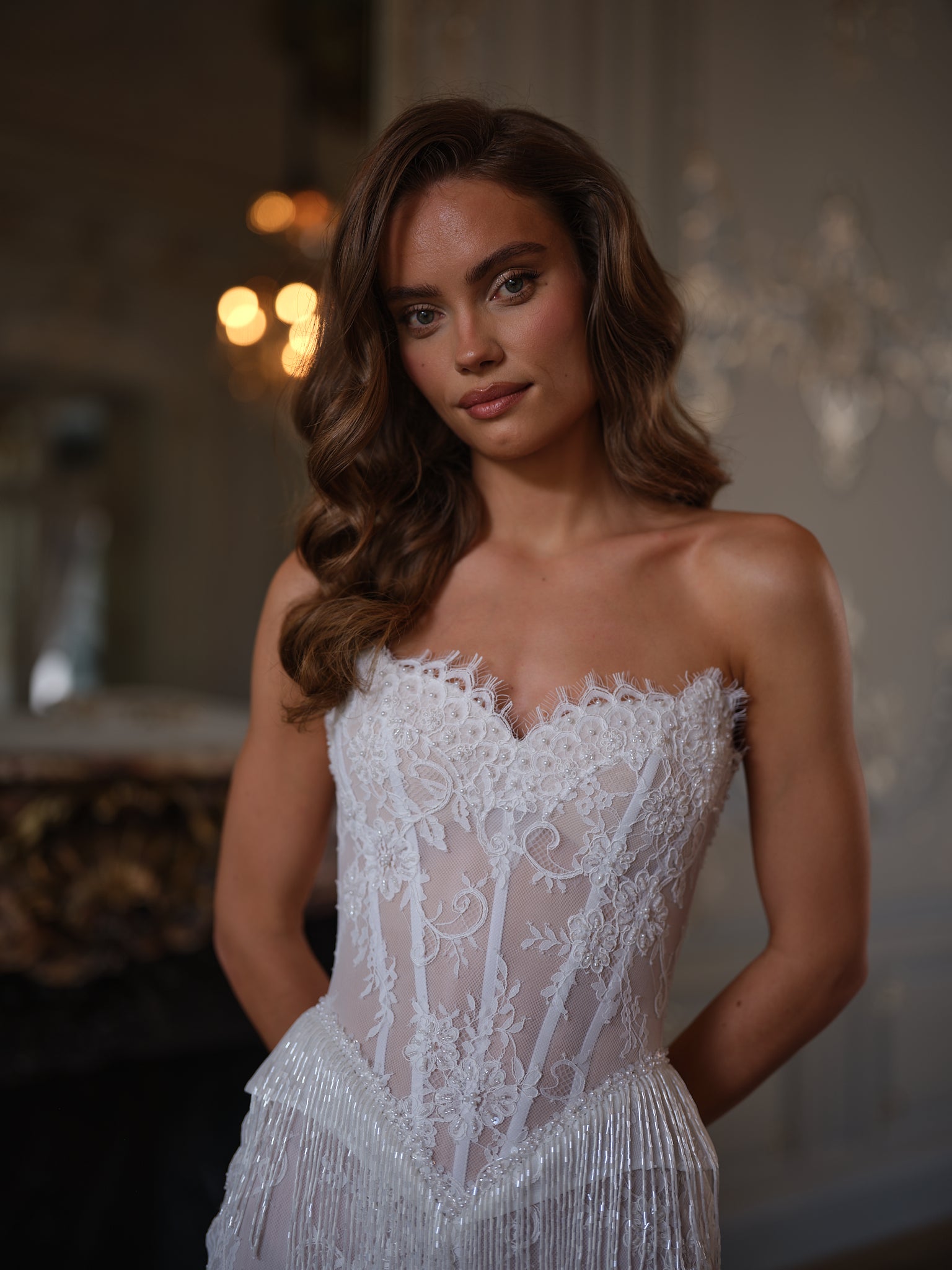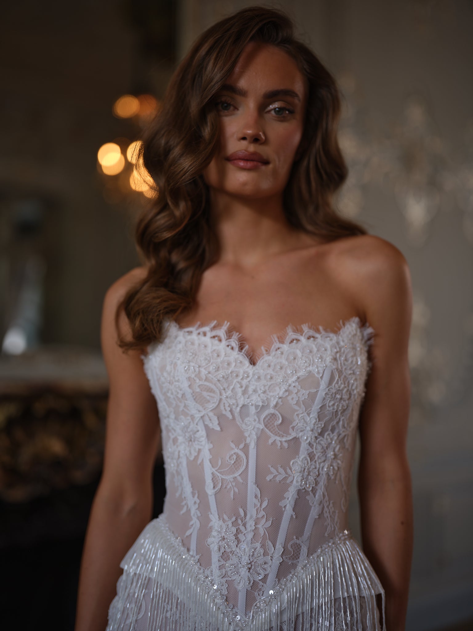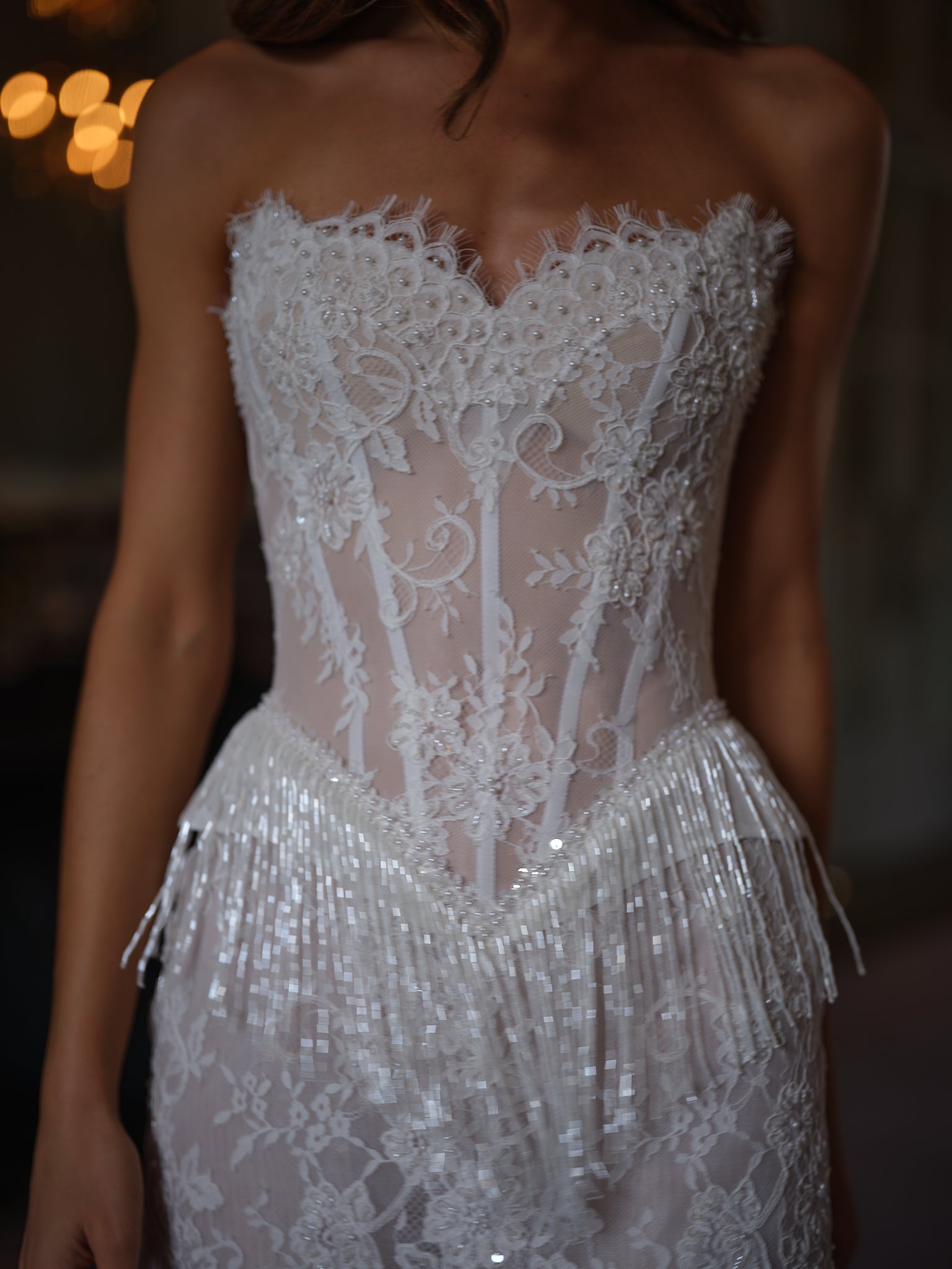 This strapless corset silhouette is sculpted with sheer lace paneling and structured boning, offering a figure-flattering fit that feels both bold and refined. The bodice flows seamlessly into a scalloped lace hem, while the addition of pearl and sequin-embellished tassel fringe transforms every movement into a statement—fluid, radiant, and irresistibly chic.