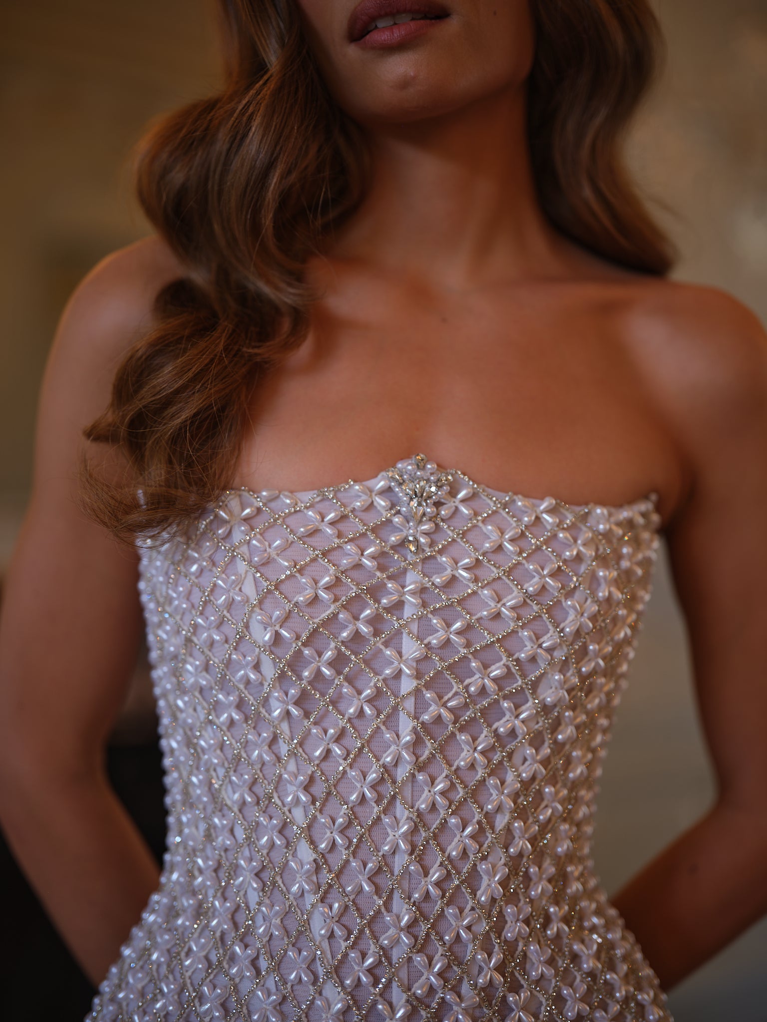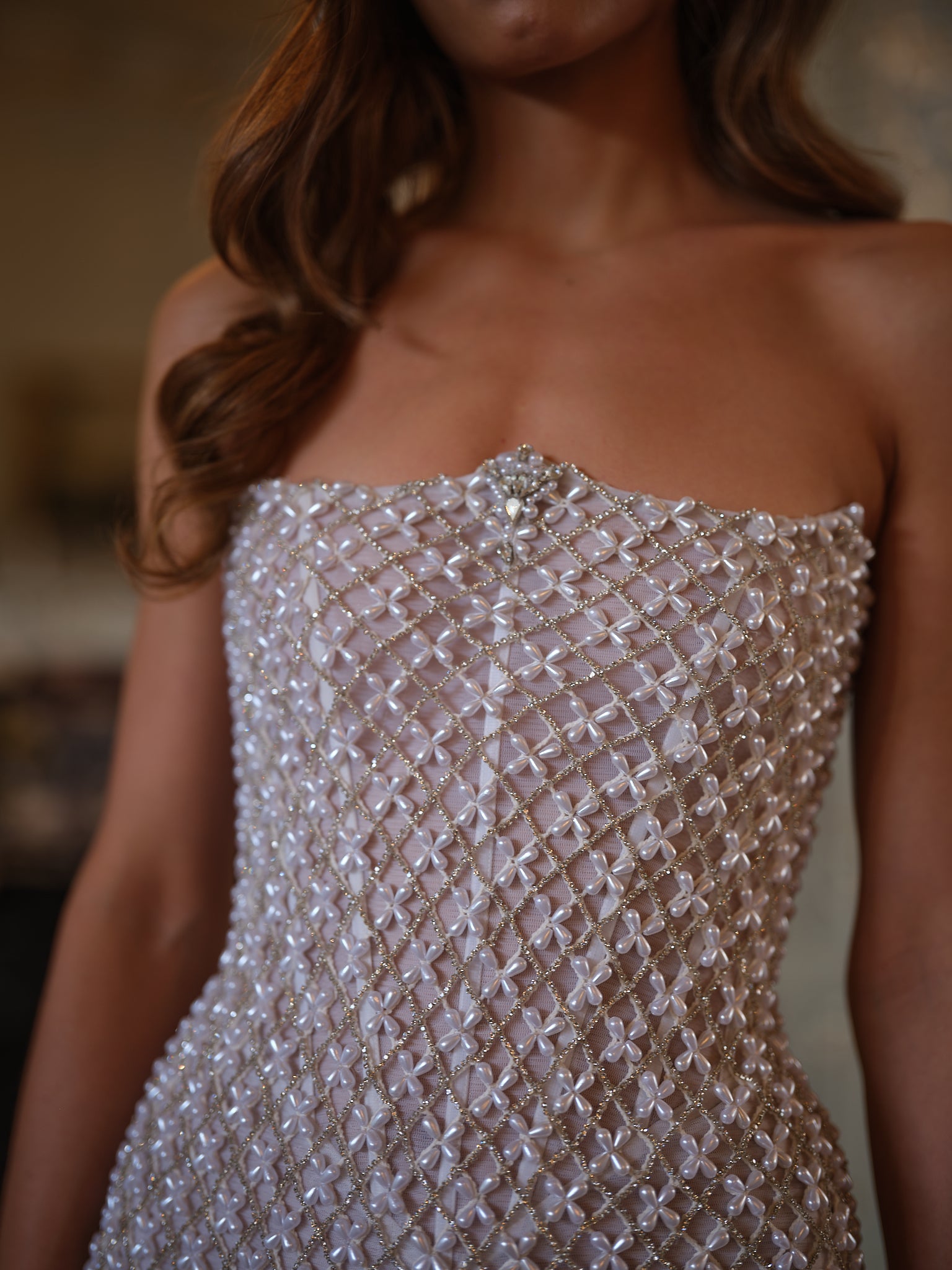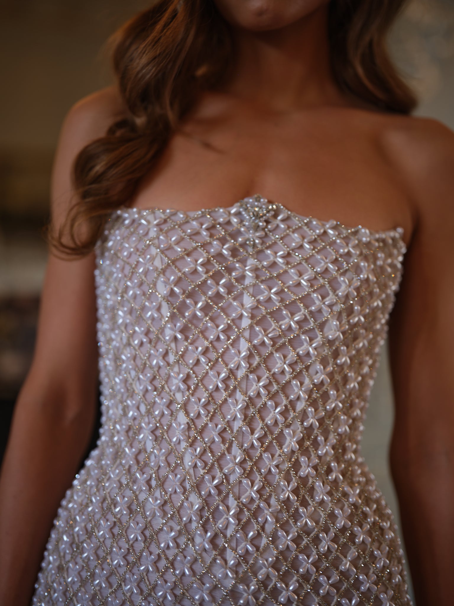 Requiring over 60 hours of meticulous handwork, skilled artisans weave together a delicate mesh of pearls and rhinestones, creating a fabric that glitters with dimension and texture. The strapless silhouette is both minimalist and striking, its clean lines allowing the embellishment to shine. At the center, a subtle focal point adds couture detailing, drawing the eye and refining the balance of the design.
